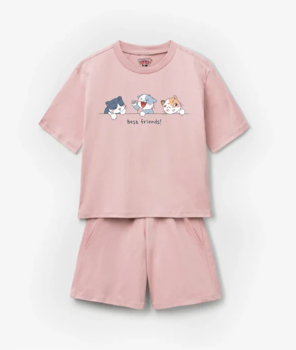 Celebrate friendship and fun with the Best Friends Cats Kids T-shirt short set. This adorable pink set features three playful cartoon cats with a “Best Friends!” slogan on the T-shirt, paired with matching shorts.