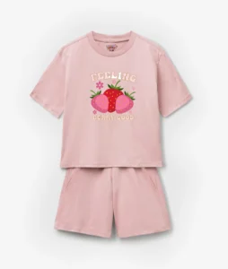 Bring a burst of freshness and positivity to your child’s wardrobe with this delightful strawberry-themed t-shirt and shorts set! Designed for both boys and girls, this unisex outfit features a charming graphic that promotes good vibes and sweet style.