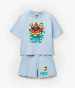 – Coordinated shorts with printed “Fresh and Cool” slogan