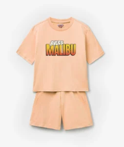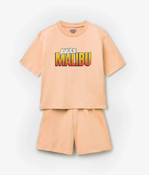 Bring the sunny vibes of Malibu to their wardrobe with this stylish and comfortable peach short and t-shirt set! Perfect for casual outings, summer days, or just lounging around, this set combines a playful graphic with soft, breathable fabric for ultimate comfort.