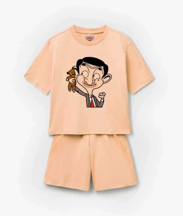 Bring fun and comfort together with this adorable Mr. Bean Cartoon Kids Coord Set. Designed in a soft peach color, the t-shirt features a playful print of Mr. Bean holding his iconic teddy, making it a favorite for kids who love cartoons. The matching shorts complete the casual yet stylish look – perfect for everyday wear, playtime, or summer outings.