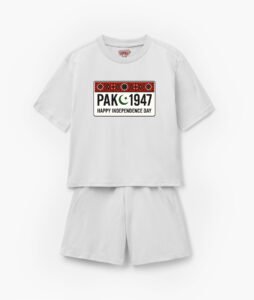 Celebrate Pakistan’s Independence Day in style with our “PAK 1947” t-shirt and shorts set for kids. This white boys and girls outfit features a bold graphic inspired by a license plate, showcasing “PAK 1947” along with traditional Ajrak motifs and the message “Happy Independence Day.” It’s the perfect outfit to show national pride while staying cool and comfortable.