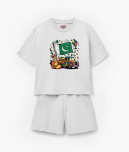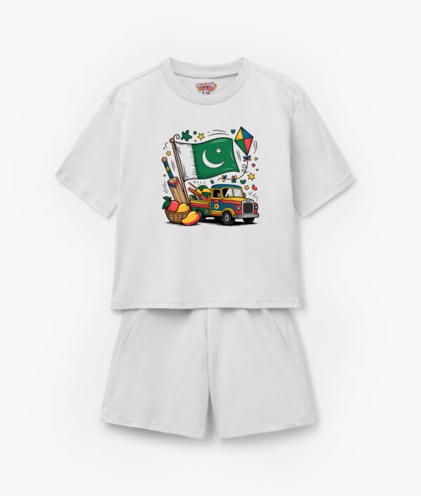 Get your child ready to showcase their national pride with this lively and iconic Pakistan Celebration t-shirt and shorts set. Designed for both boys and girls, this unisex outfit brings together some of the most beloved symbols of Pakistan in a fun and festive design.